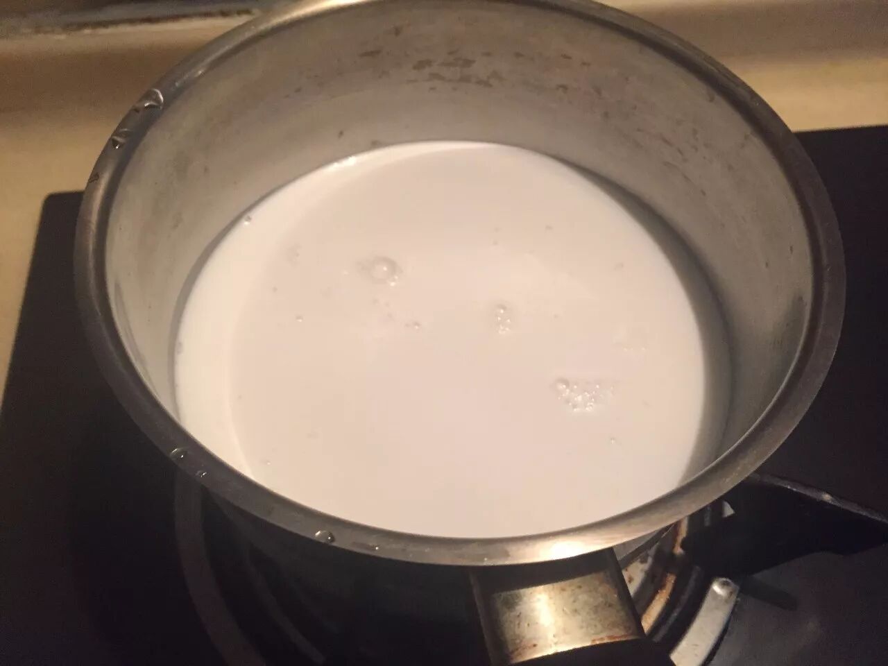 2.把纯牛奶、椰浆、砂糖倒入锅中加热到50-60℃