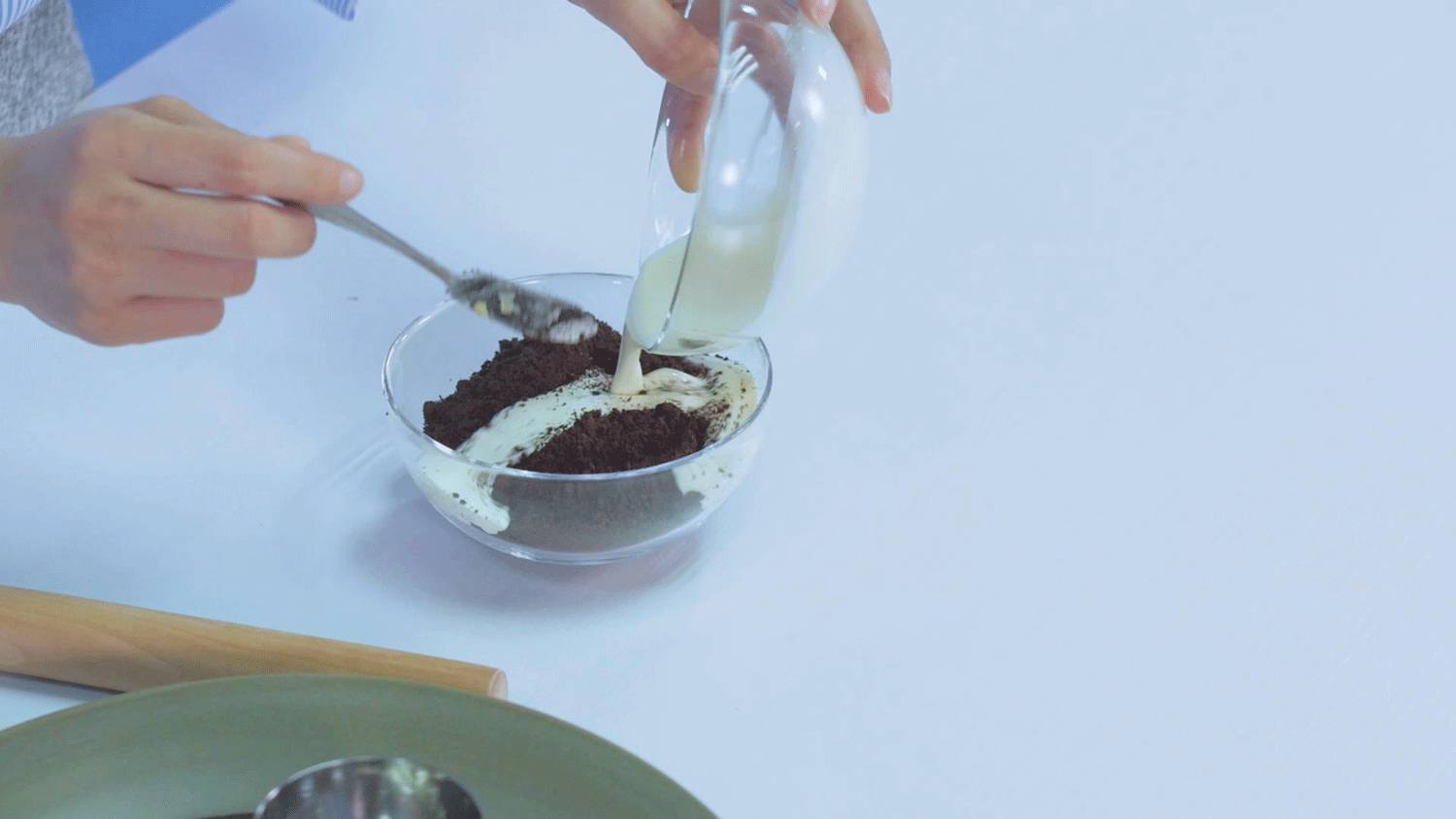 再将淡奶油倒入奥利奥饼干碎内,搅拌均匀