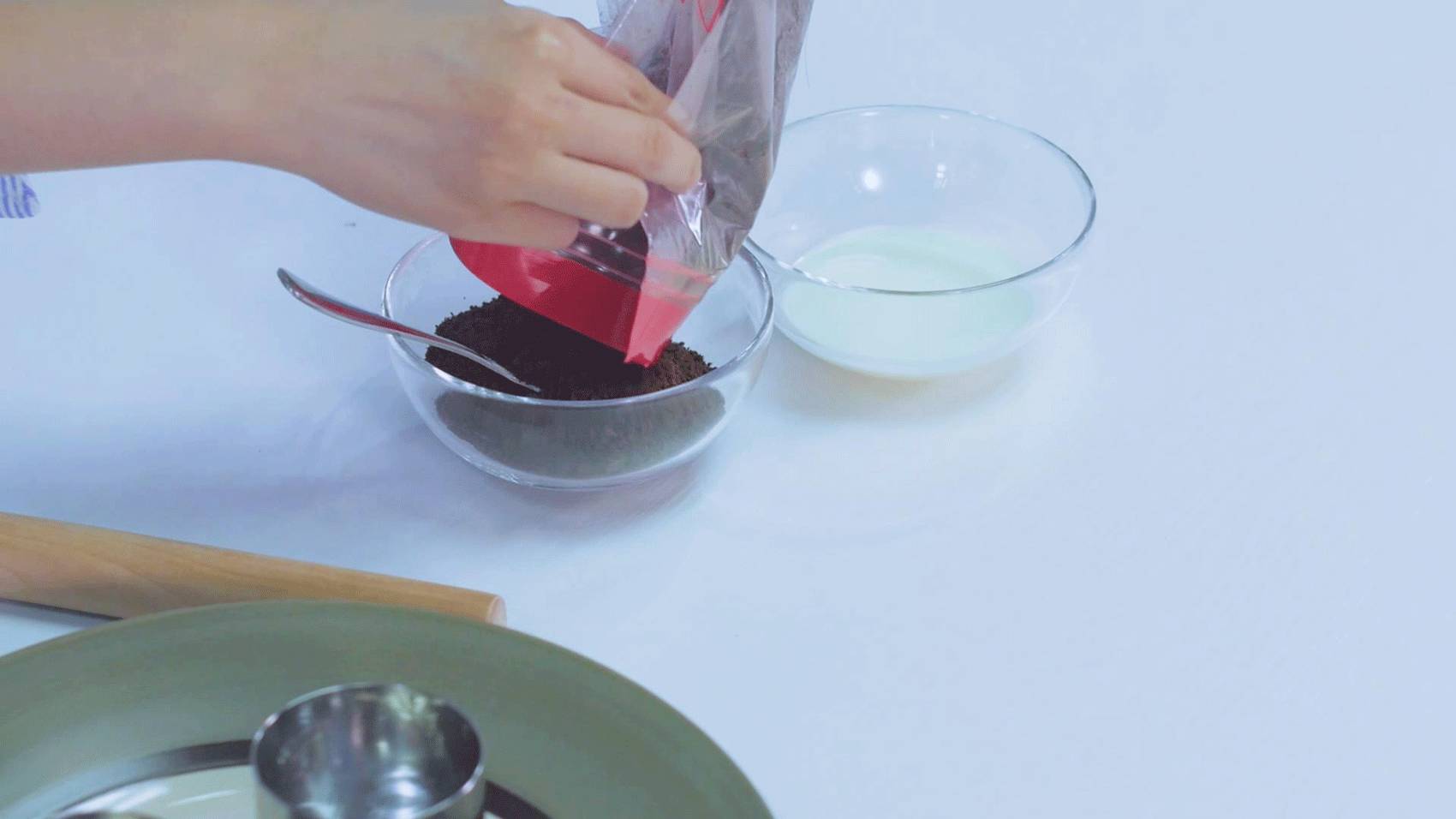 敲碎好的奥利奥饼干碎分一部分的分量倒入容器内备用