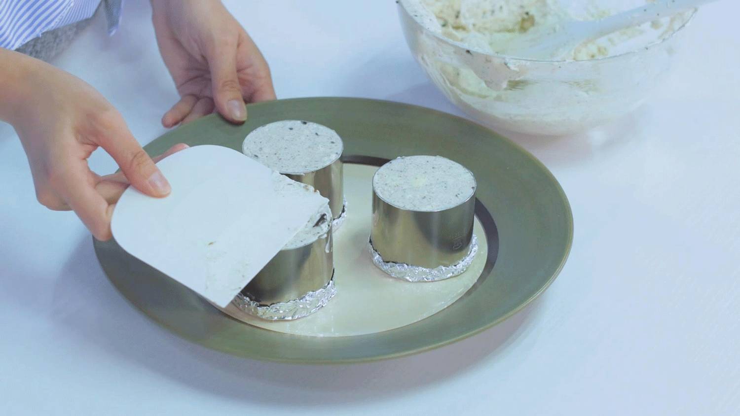 用刮刀将模具上的奥利奥奶油奶酪刮平即可,放进冰箱冷藏3个小时