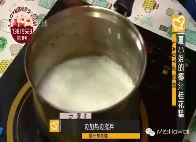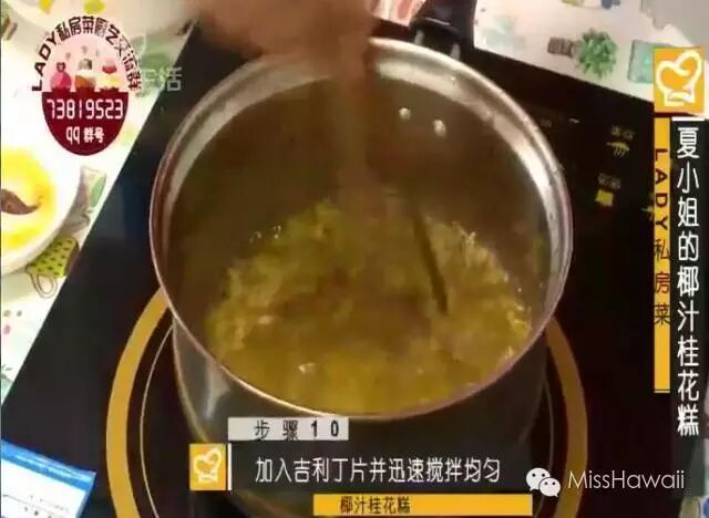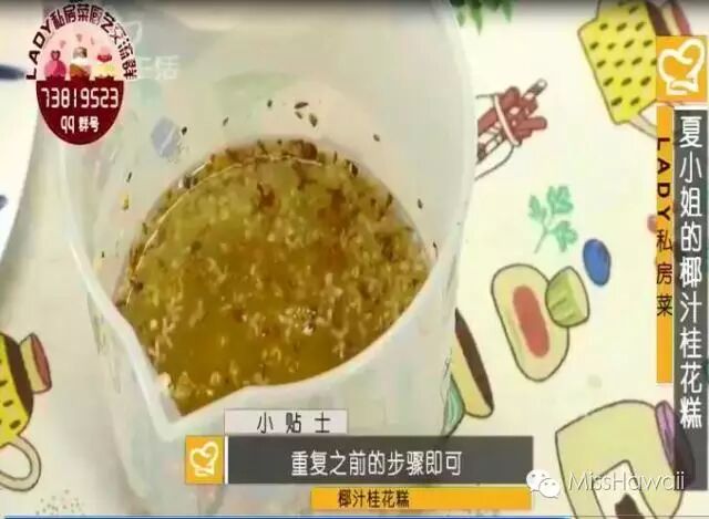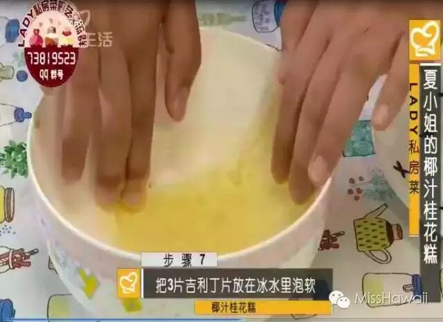 中式传统甜品也可以很貌美:椰汁桂花糕 2023-04-19 23:50:29 颜值担当:椰汁桂花糕做过很多西式的甜点,比如:、巧克力熔岩、法式红酒啤梨......其实,我们也有很多传统的甜品同样精致和美味,一点不输西式甜点,最重要的是,绝大多数中式甜品都不需要用烤箱,制作起来难度也更小。在炎炎夏日里,如果有一款甜品不需要用烤箱就能做出来,那就赶紧动手试一试吧!何况它又长得这么美~~一起来做做看吧~首先,我们来看一下需要哪些原材料:然后,请跟着我的视频截图开始制作这道美食吧:(准备一个保鲜盒,在底部和四周都报上保鲜膜,然后倒入加入吉利丁溶液的椰汁。)(按照一层椰浆+一层桂花,直到把所有的椰浆和桂花水都用完。之后,再放入冰箱冷藏2个小时左右,让椰汁桂花糕完全凝固即可。)最后,按照个人喜好,切成形状、装盘就完成啦~这里还有更多好吃的:太热了!不想起油锅怎么办?那就做这个吧!0难度的高逼格美食:法式红酒啤梨没有你的夏天可以,没有冰淇淋不行。夏天,请来一碗Q弹爽口的芋圆网红青团卖辣么贵,不如自己在家做吧长按二维码添加关注: