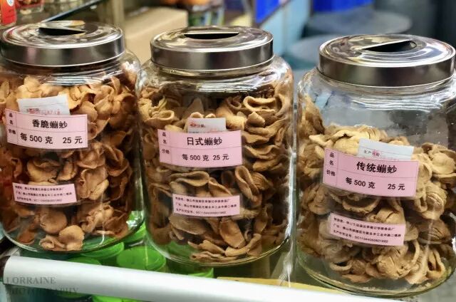 除了蹦砂,李禧记铺内还有好多种小食。有些李禧记是可以试吃的,而且店员会很欢迎试吃。鸡仔饼、合桃酥、笑口枣、南乳薄饼、杏仁饼,其中洛伦最喜欢的是最脆口的雪耳,因为我吃硬不吃软呀。