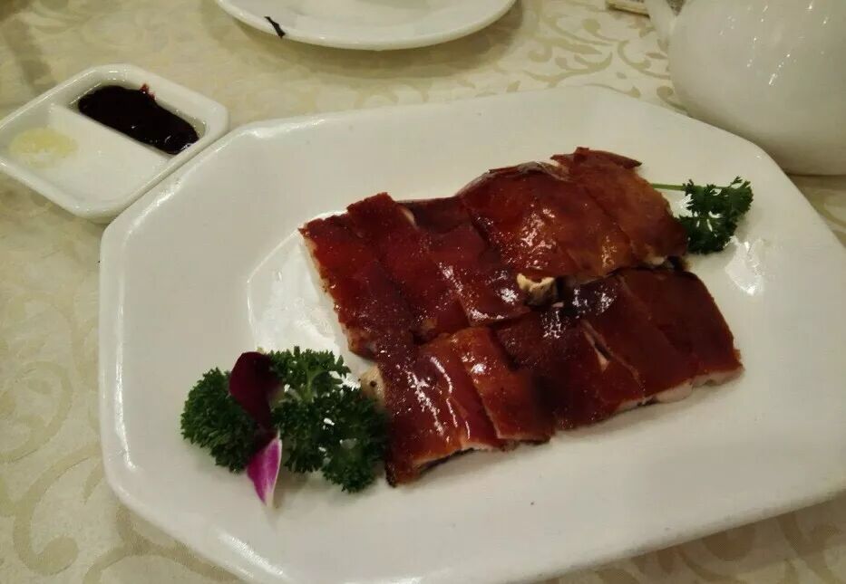 除了盐焗鸡,我还喜欢这里的乳猪,皮薄,烤得很香脆,肉质很细滑,口感鲜嫩,蘸点砂糖或是蚝油,超美味。