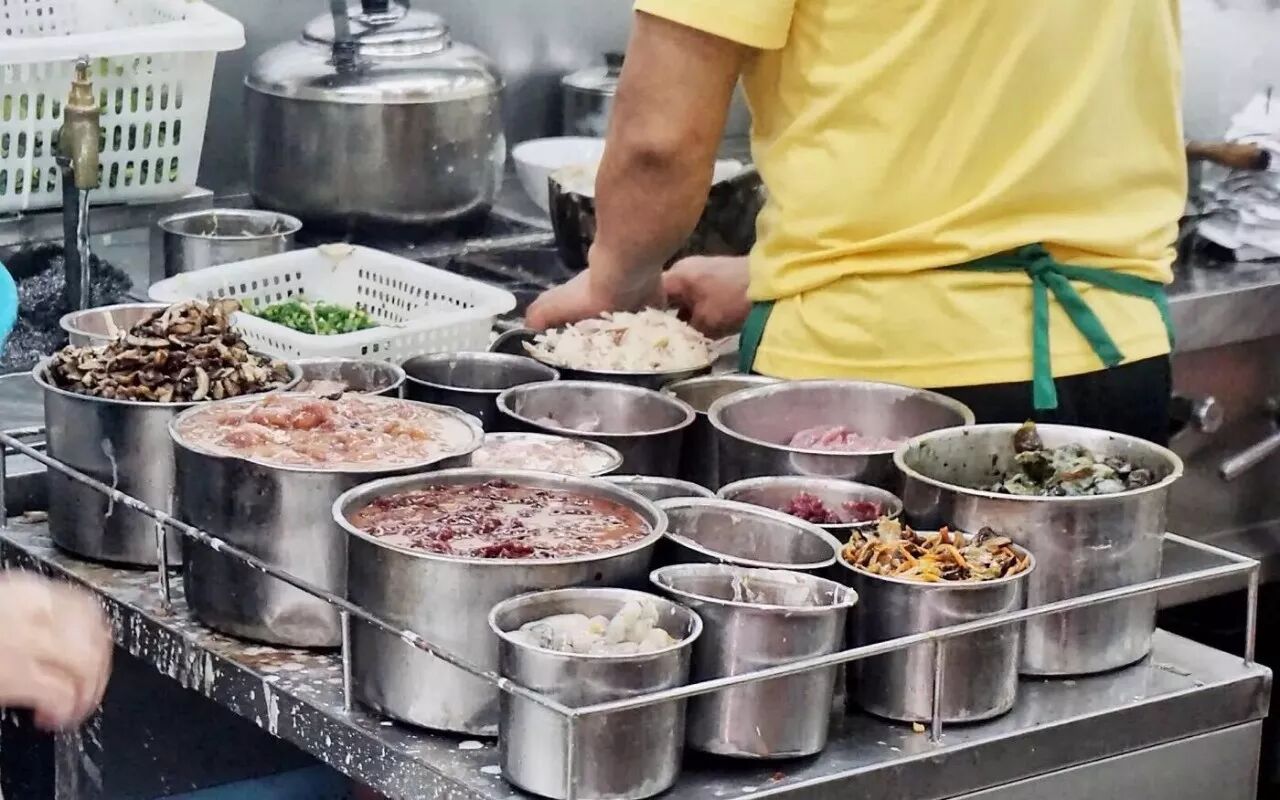 刚靠近制作台,就被滚烫的热气熏到,桌上摆着琳琅满目的材料,看起来选择还真多,师傅在炉前忙碌着,熟练的做着肠粉和煮生滚粥,丝毫不在意那种热辣的感觉。