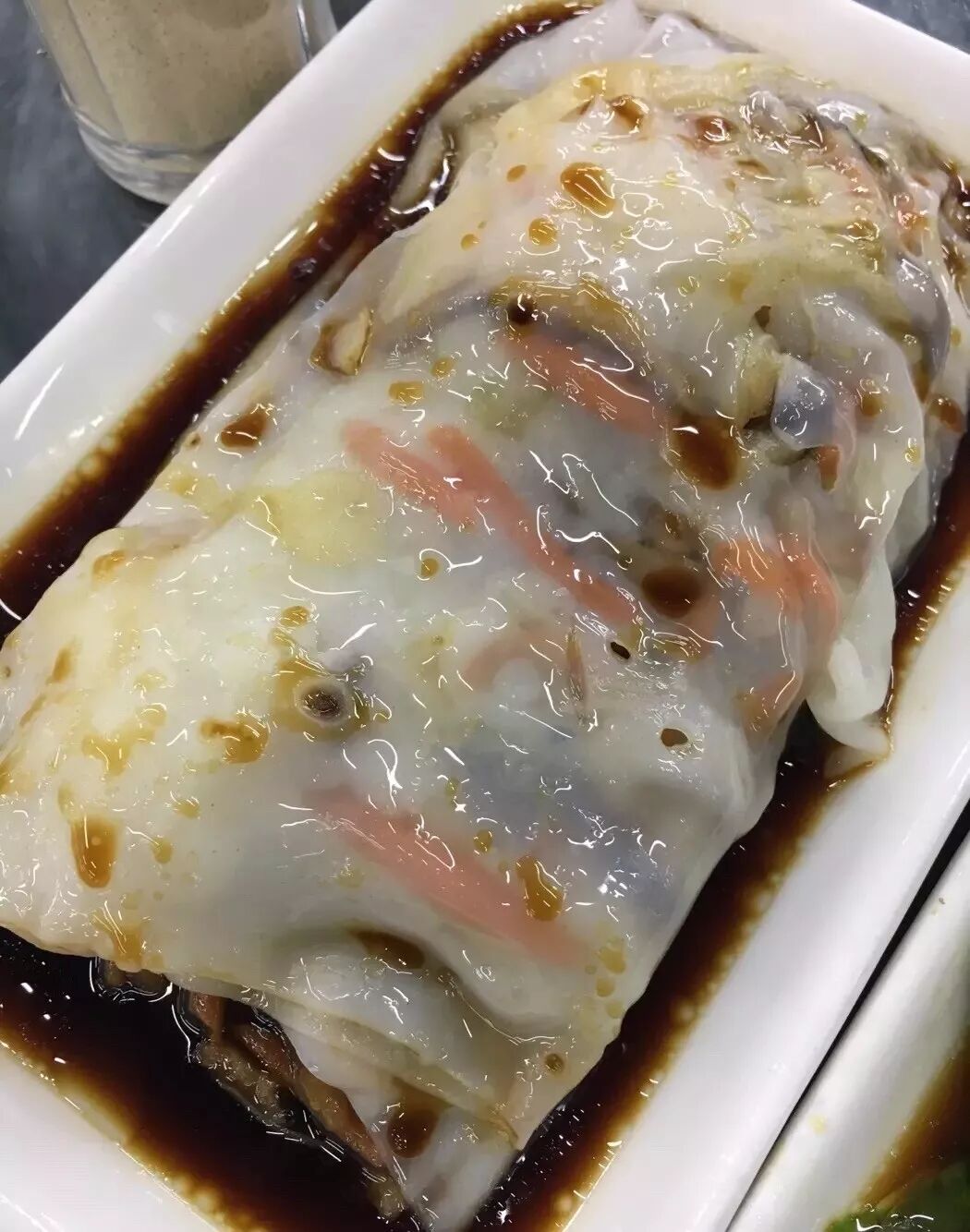 一来就点个最贵的,透亮的肠粉加上泛着油光的酱油,看着就很有食欲,翻开一看,料超多,牛肉很大片,虾仁很大只,还有香菇的搭配,超级好吃!要是里面是韭黄不是青菜就更好了。