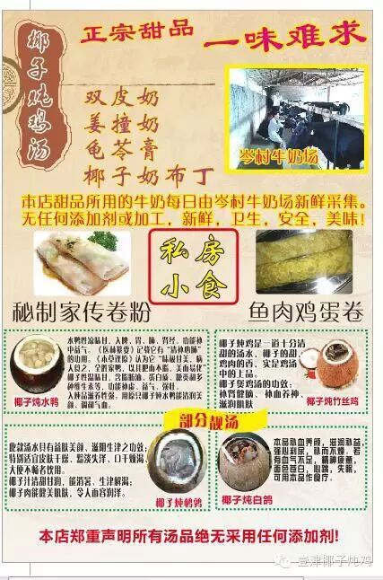 前段时间有街坊问,这里有没有饭食啊?有没有甜品啊?都有人说,汤很好喝,味道好,肉很多,也有的说椰子太小了,面对不同的消费人群,我们乐意接受意见,也取长补短来改变,满足大家,我们的鸡汤的品质也得到了认可。