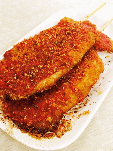 鱼糕棒即点即做,超大一根,挤上了蕃茄酱和芥末浆,味道不错,里面还能吃到超大块的鱿鱼粒,正!