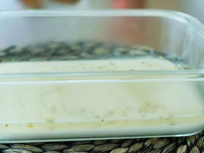 3、将吉利丁溶液加入步骤一的椰浆内,拌匀,然后待凉。倒一层椰浆液在容器内,放入冰箱冷藏20分钟