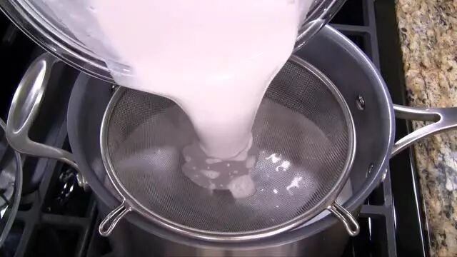 2.通过滤网倒入煮锅里面。开低火慢慢的搅拌加热,一般加热5~6分钟就可以了。