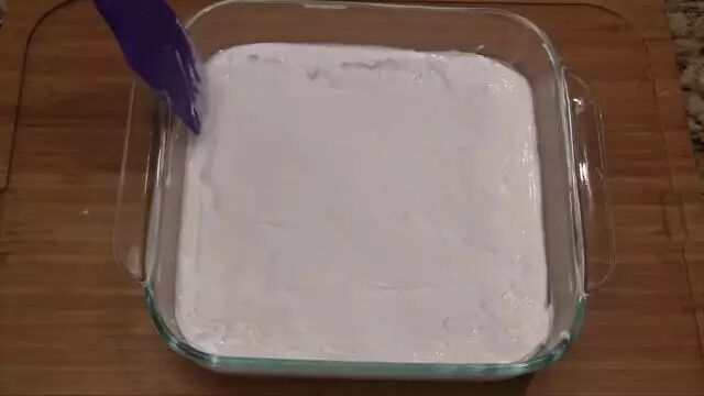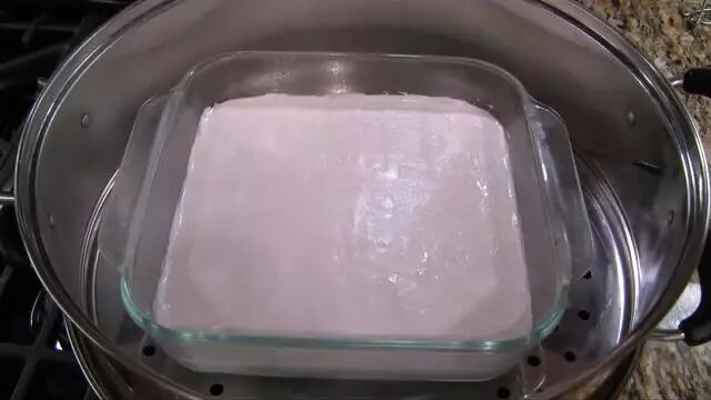 4.把面糊转移到放行玻璃器皿,抚平表面。同时在煮锅中加水煮沸。