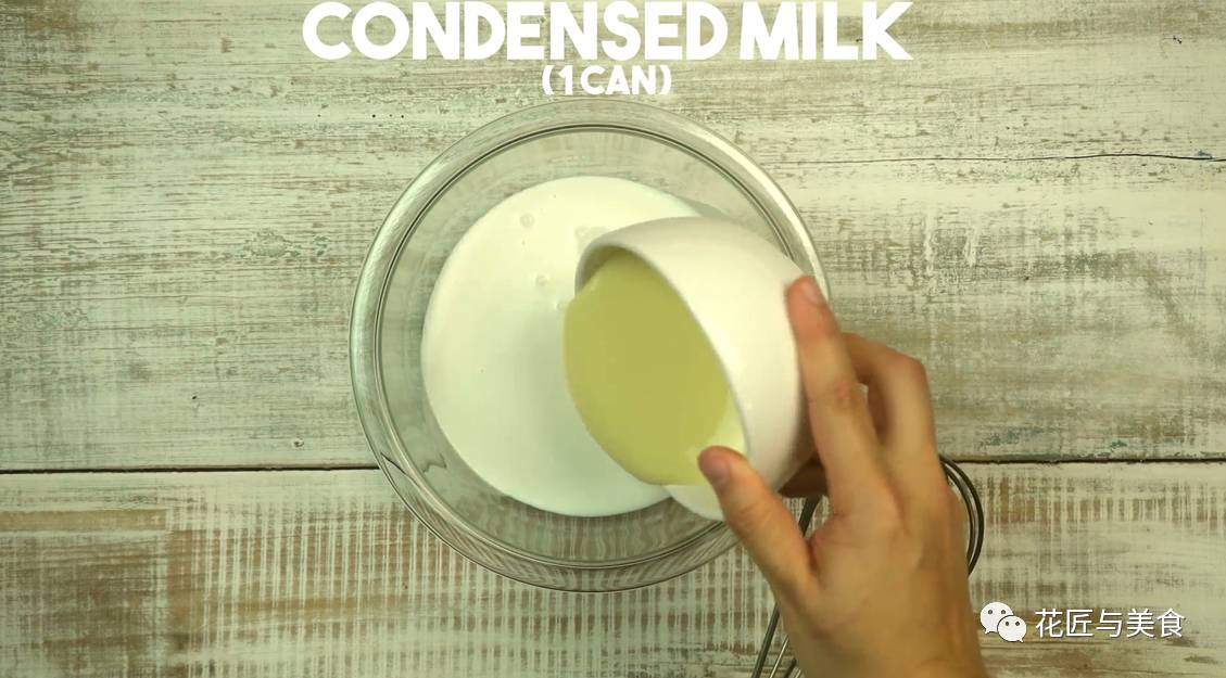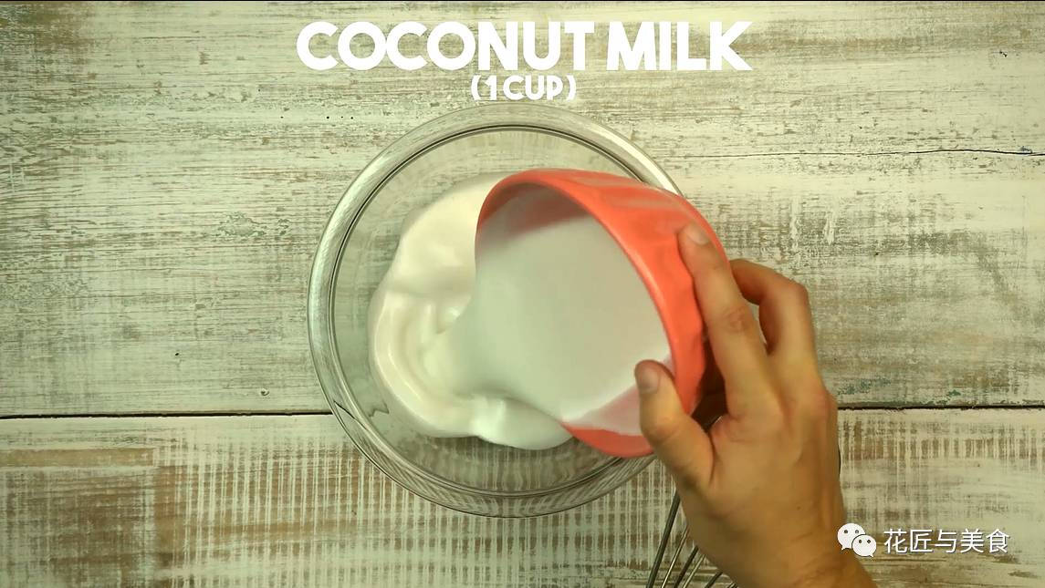 1.将椰奶、炼乳鸡蛋、和磨碎的椰子混合至一个碗里。先在碗里倒入椰奶。