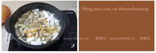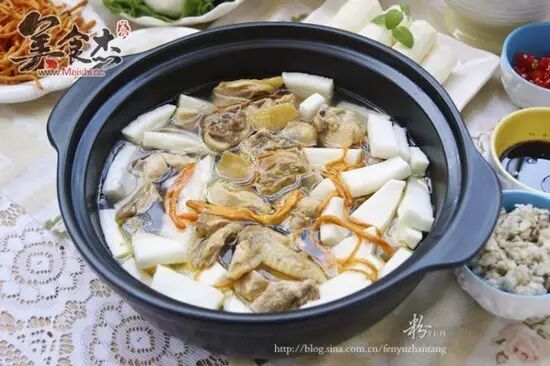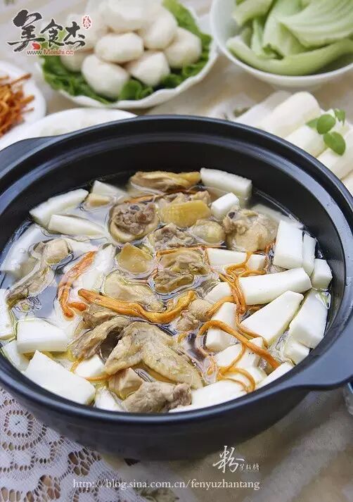 3.鸡块煮熟(煮开后再煮3-5分钟),放入少量新鲜虫草花装饰一下,即可开吃,锅内可加铁棍山药、墨鱼丸、马蹄、大芥菜等煮熟一起食用。