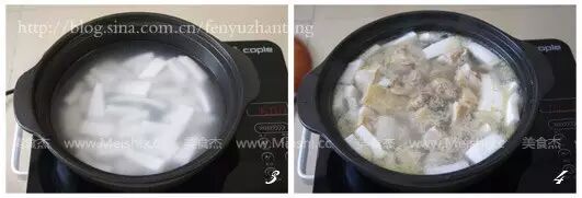 2.砂锅里倒入椰子汁和椰肉,煮开后放入鸡块,烧开后捞去表面的浮末。