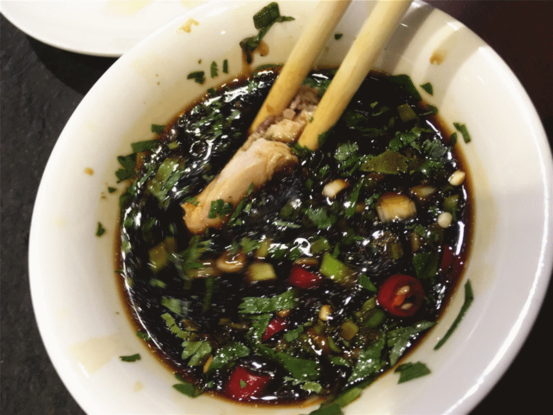 当然咱们东北人比较口重可能会吃不惯太清淡的,这时候就要靠这个特色蘸料了,把鸡肉多泡一会儿,再送入口中,你就能尝到沙姜的鲜甜味道了,