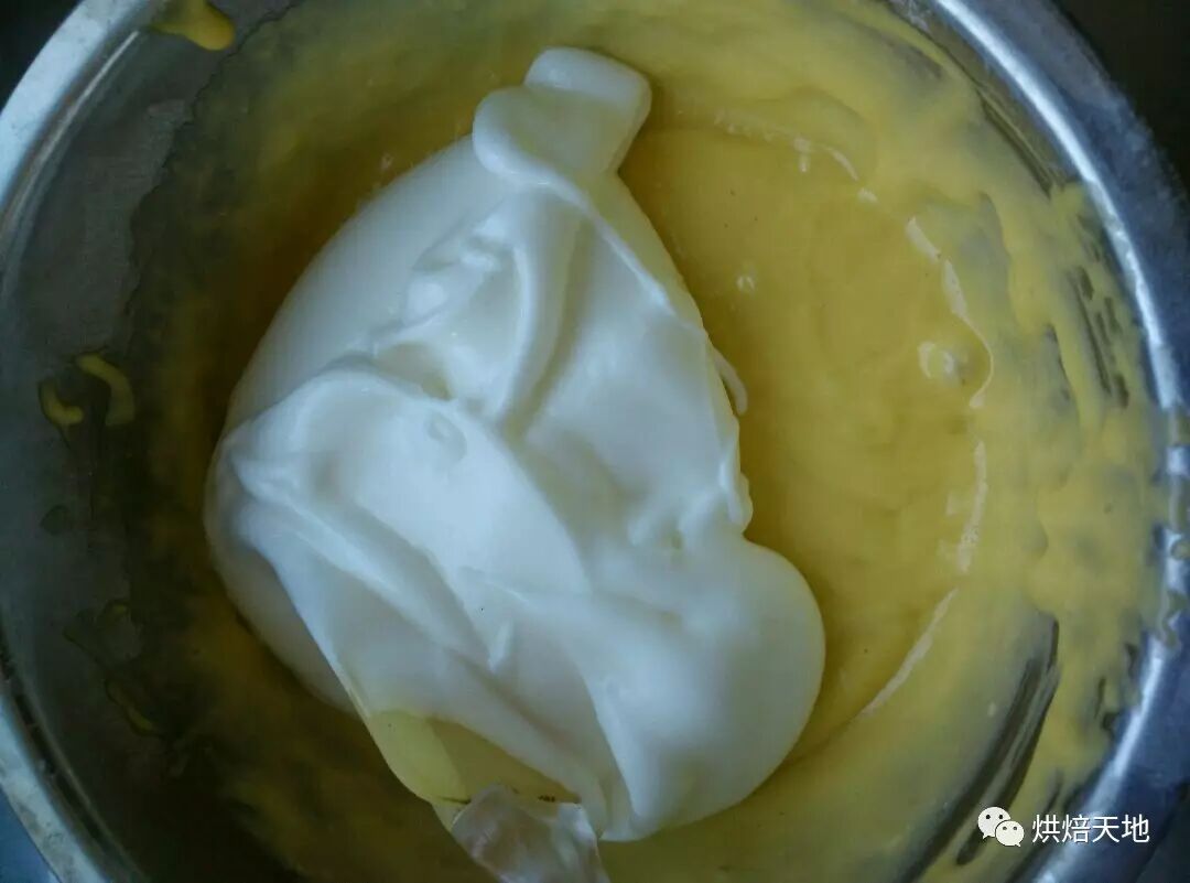 7. 然后倒入2/3的蛋白盆里,翻拌