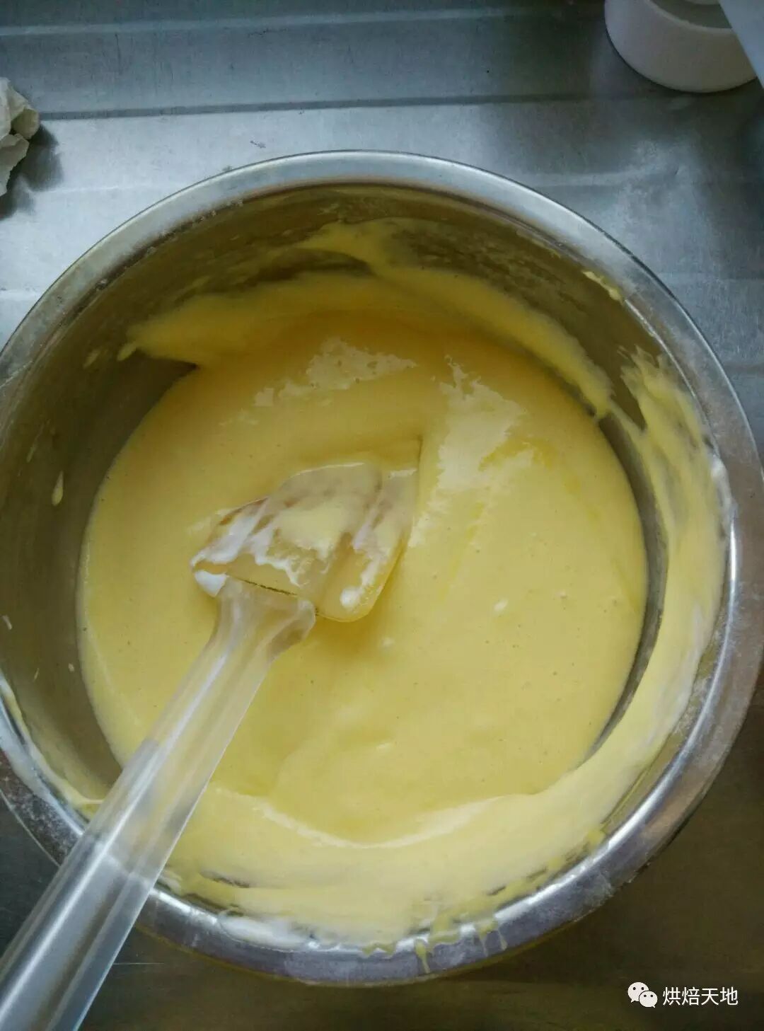 8. 预热烤箱,175度/20分钟,入烤盘铺油纸,倒入蛋糕糊,震荡出泡