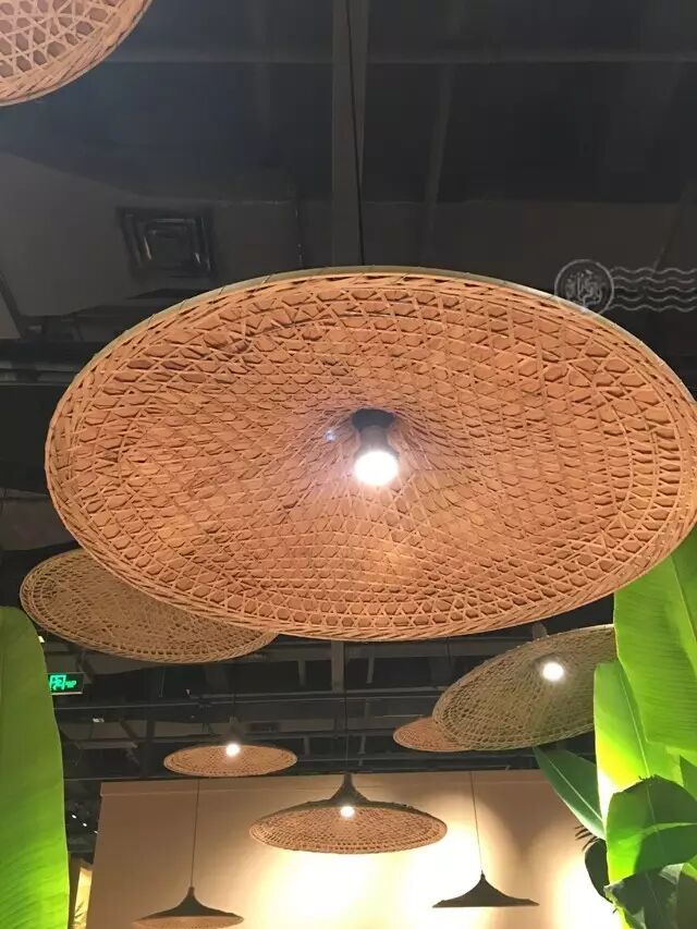 如同斗笠一样的竹编做成灯罩,别有创意,一顶顶的从天花垂下,似乎有江南蓑衣斗笠的感觉。