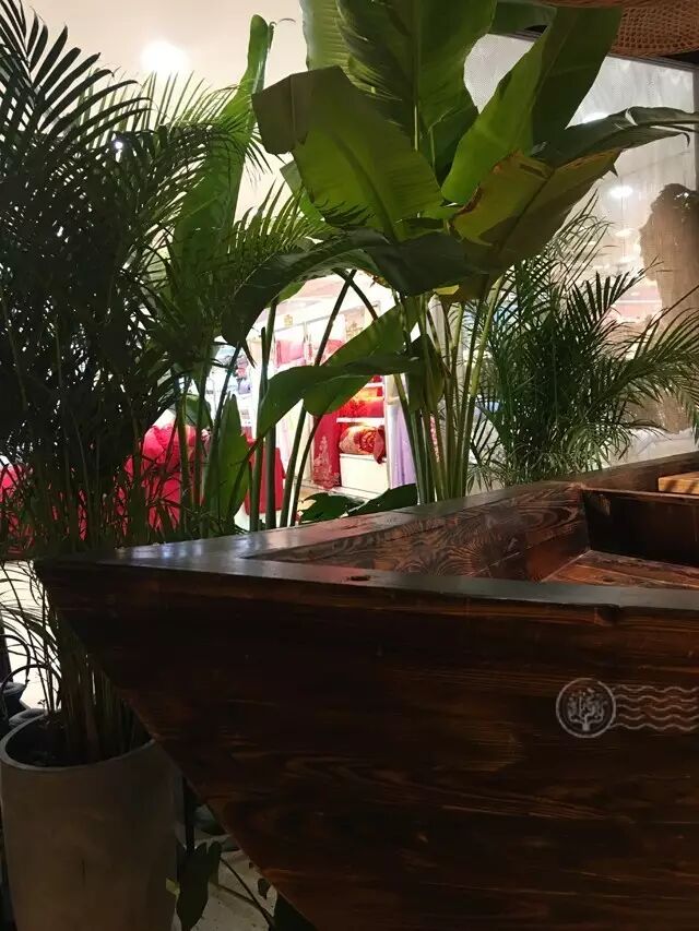 一艘老木船驶进了餐厅,老木船上设计了餐桌,别有韵味。旁边绿植环绕,芭蕉树,椰子树、老木船,如同在海边那般。
