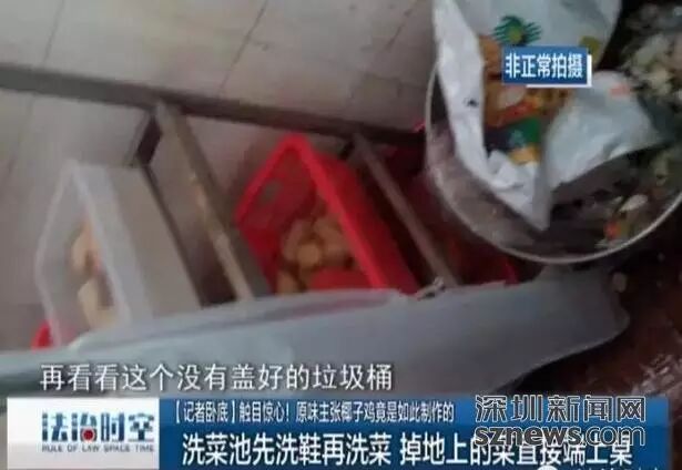 员工在洗菜池先洗鞋再洗菜,掉地上的菜直接端上桌。