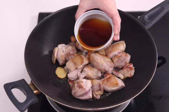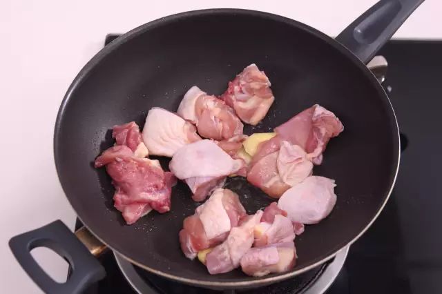 2.热锅入油,加入姜片爆炒,再加入鸡肉炒至金黄。
