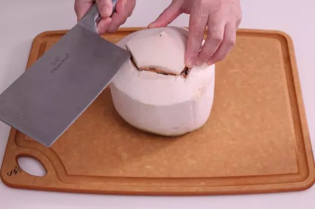 2.椰子洗净,切去顶部,倒出椰子汁备用。