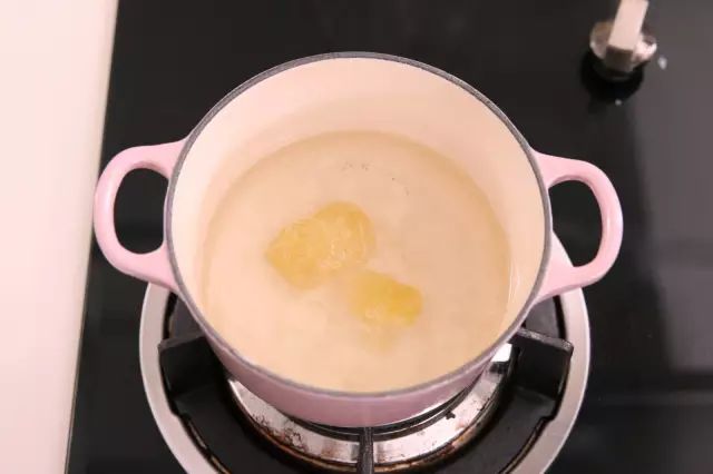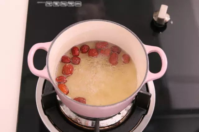 3.加入黄酒和红枣,大火烧开后,调至中火,煮30分钟。