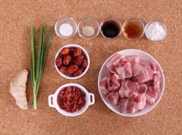材料:红枣、排骨、枸杞、姜、葱、料酒、酱油、玉米粉、盐