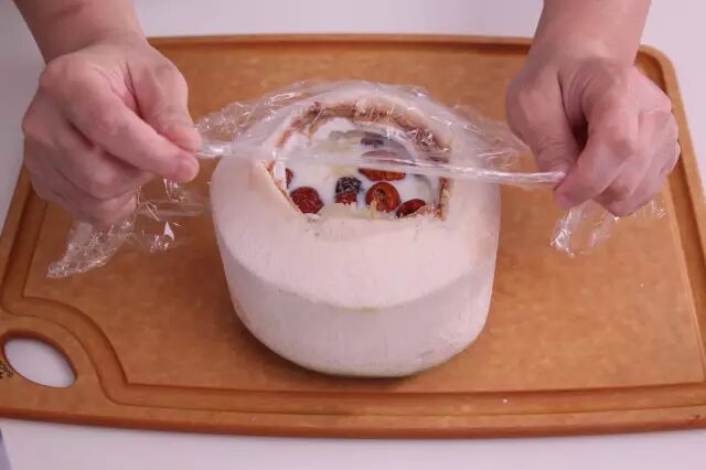 4.将所有食材放入椰子内,用保鲜膜密封。