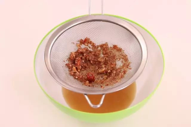 2.将红枣冰糖水转移到搅拌机搅匀,然后过滤得到红枣糖水,不要红枣渣。