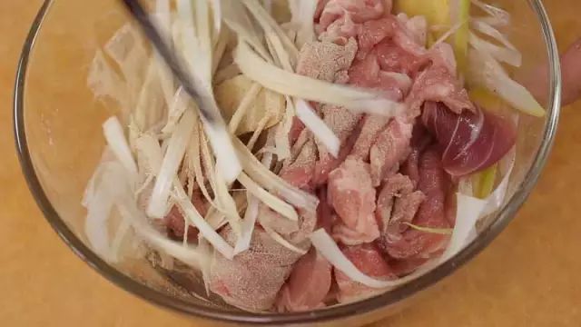 2.在碗里加入羊肉、姜片、葱、胡椒粉,混合均匀,腌制15分钟。