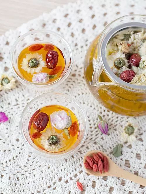材料:红枣、菊花、玫瑰、枸杞、洋参片、桂圆、绿茶、冰糖