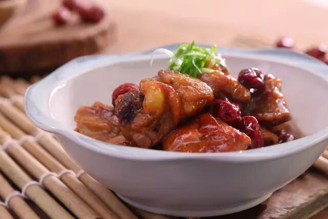 材料:红枣、鸡、黄酒、姜、葱、糖、盐、油