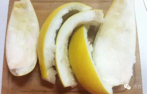 2.将新鲜柚子皮,削去柚子皮表面黄色那层表皮,然后放到水里浸泡,当柚子皮吸收满水分后,就用力把水压出,反复四次,这样柚子皮就会没有了苦涩的味道了。