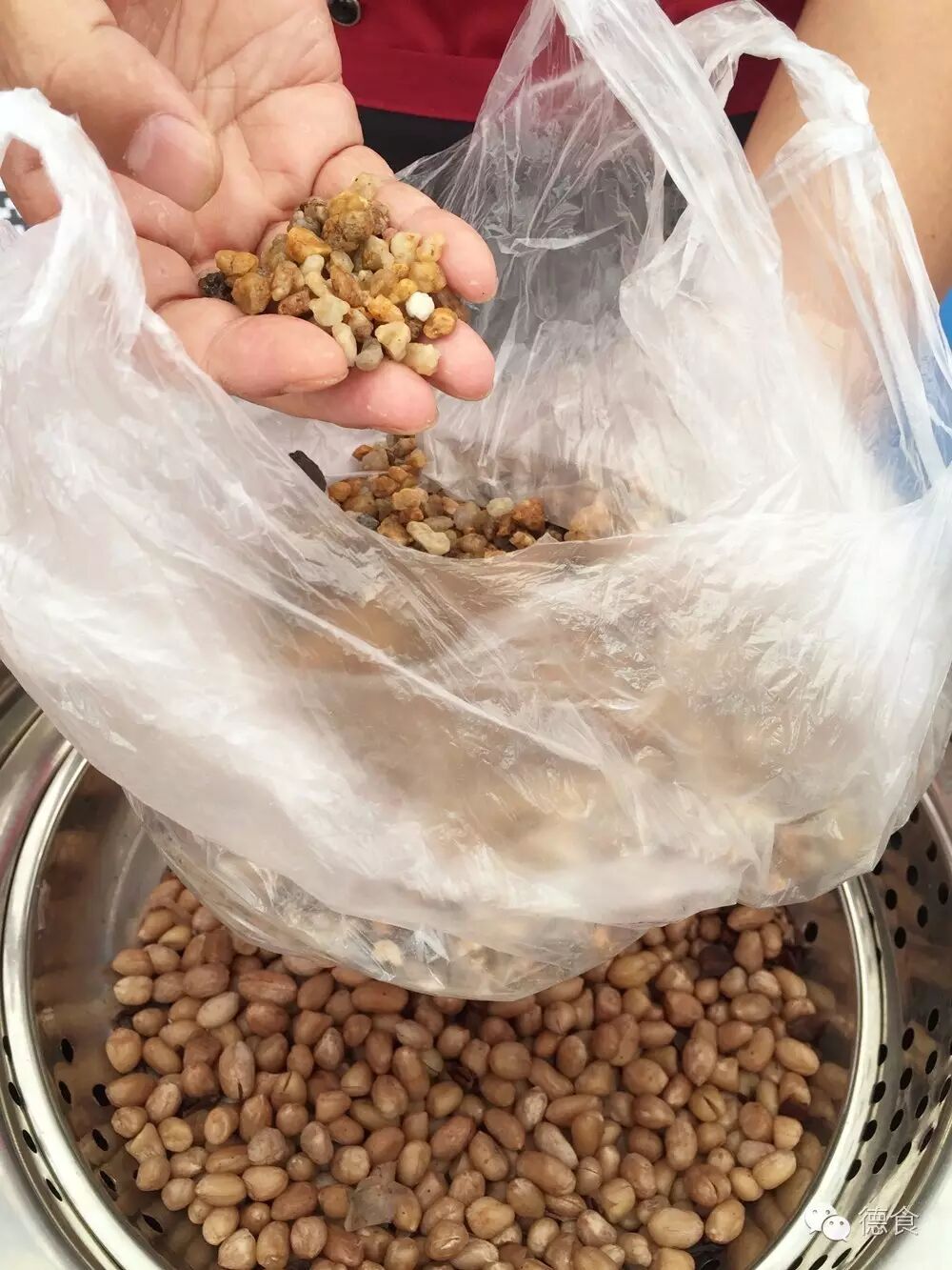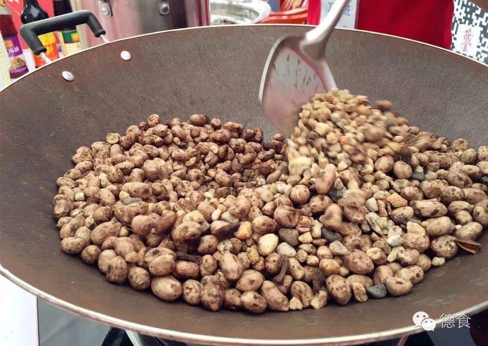 2.海沙炒热后,就把经过秘制药材浸泡过的花生肉放到锅里和海沙一起炒。之所以先炒热海沙,是为了通过海沙让花生受热更均匀。