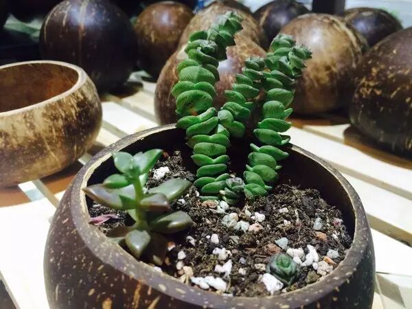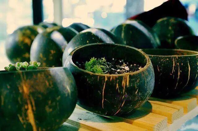 吃完的椰子壳,别扔掉,放些土,就是一个现成的盆栽容器,可以种多肉!