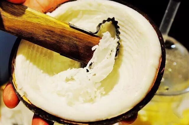 上层椰肉是乳白滑嫩的,椰肉挖出后搅打成汁,再辅以些许淡奶调配。