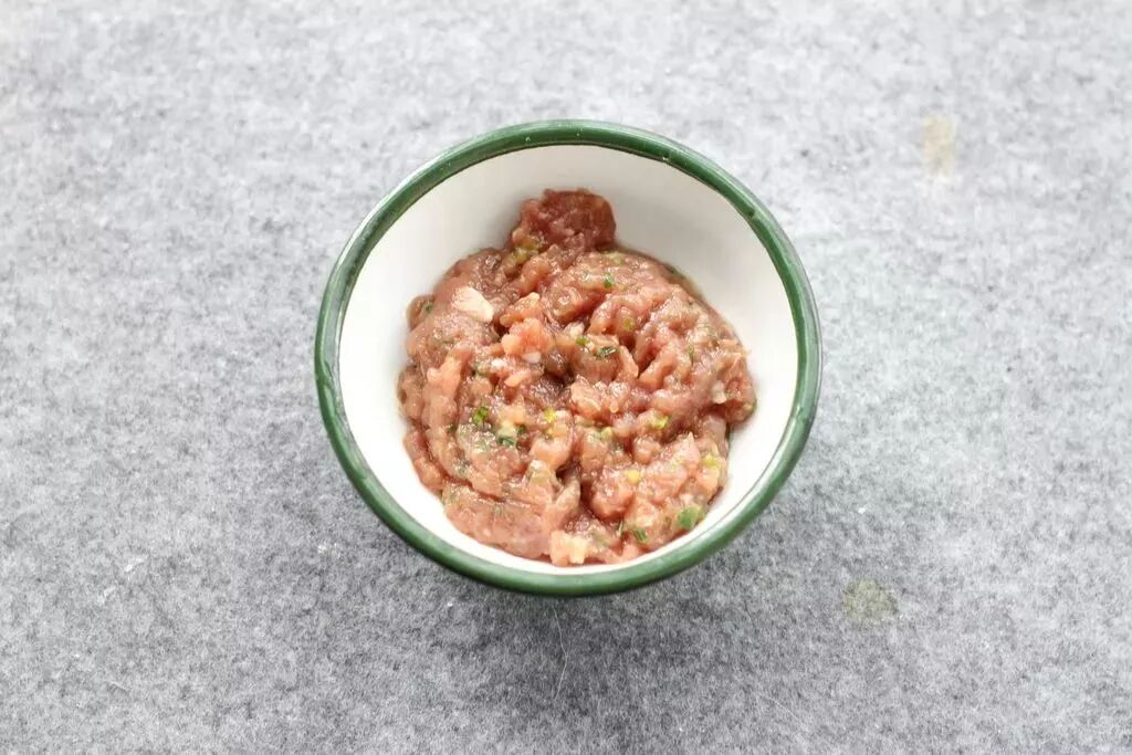 2、猪肉剁碎,加入食盐、酱油、料酒和五香粉搅拌均匀。分次加入30ml水搅拌上劲,最后加入葱花和2汤匙油搅拌均匀。