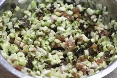 4.西葫芦、葱、姜、蒜、木耳碎和肉馅搅拌均匀,然后加入盐和食用油搅拌均匀,放置一边备用。