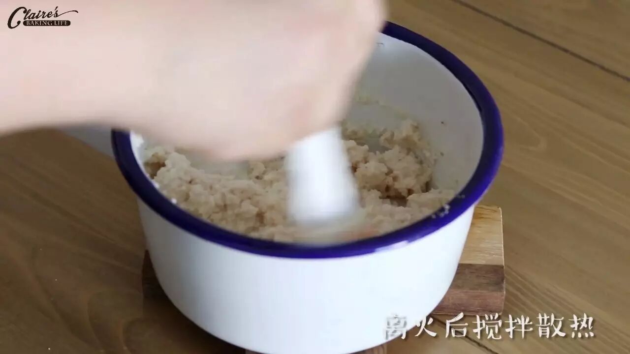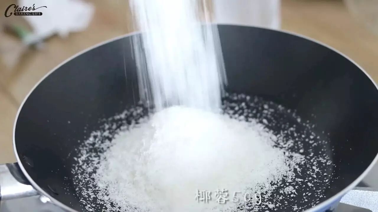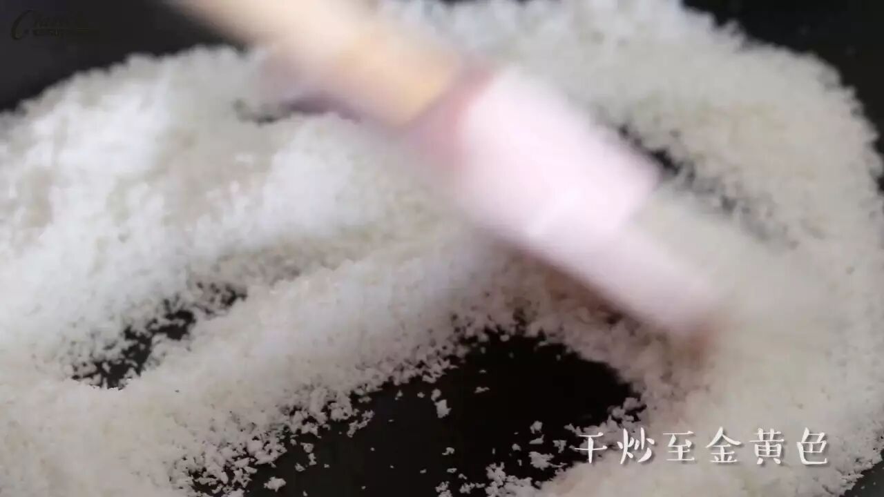 1、炒椰蓉,全程开小火,大火容易炒糊。也可以用烤箱烤,具体温度根据自己的烤箱调节,同样的也是小火。
