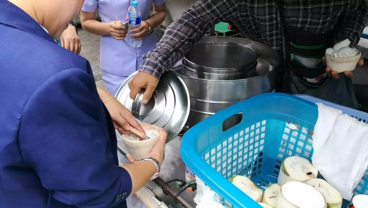 好和谐的一幕啊!顾客帮小贩一起做一份25铢的椰肉冰激凌