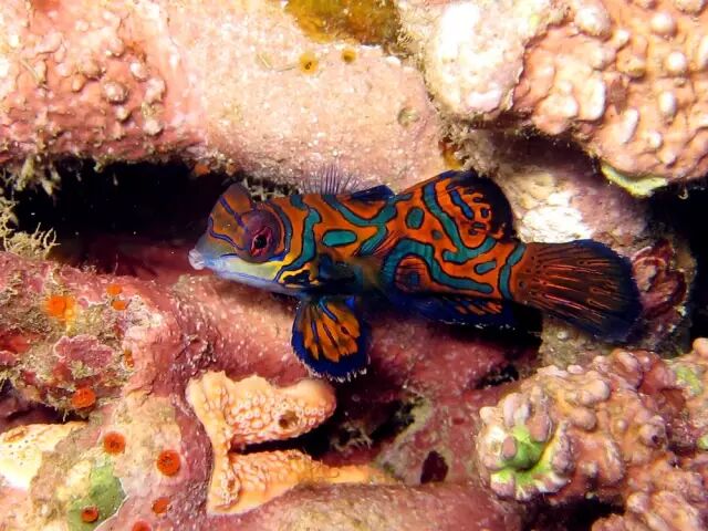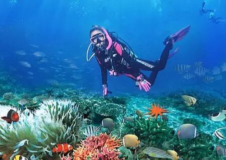 最深处达1566米,清澈的海水能见度达35至40米,海底生物数量庞大、种类繁多,特别是绵延近百公里的水下珊瑚悬崖礁壁,上面“绽放”着许多珊瑚花,还有各种热带观赏海鱼以及海星、海蛇、海胆,堪称当之无愧的潜水天堂。