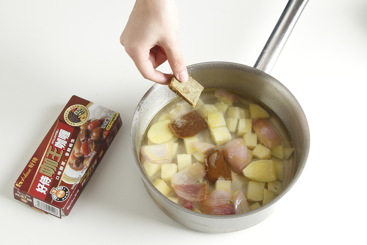 4. 放入好侍咖王咖喱块和浓汤宝,转中火熬煮出香味,撒入黑胡椒,制成咖喱火锅锅底。