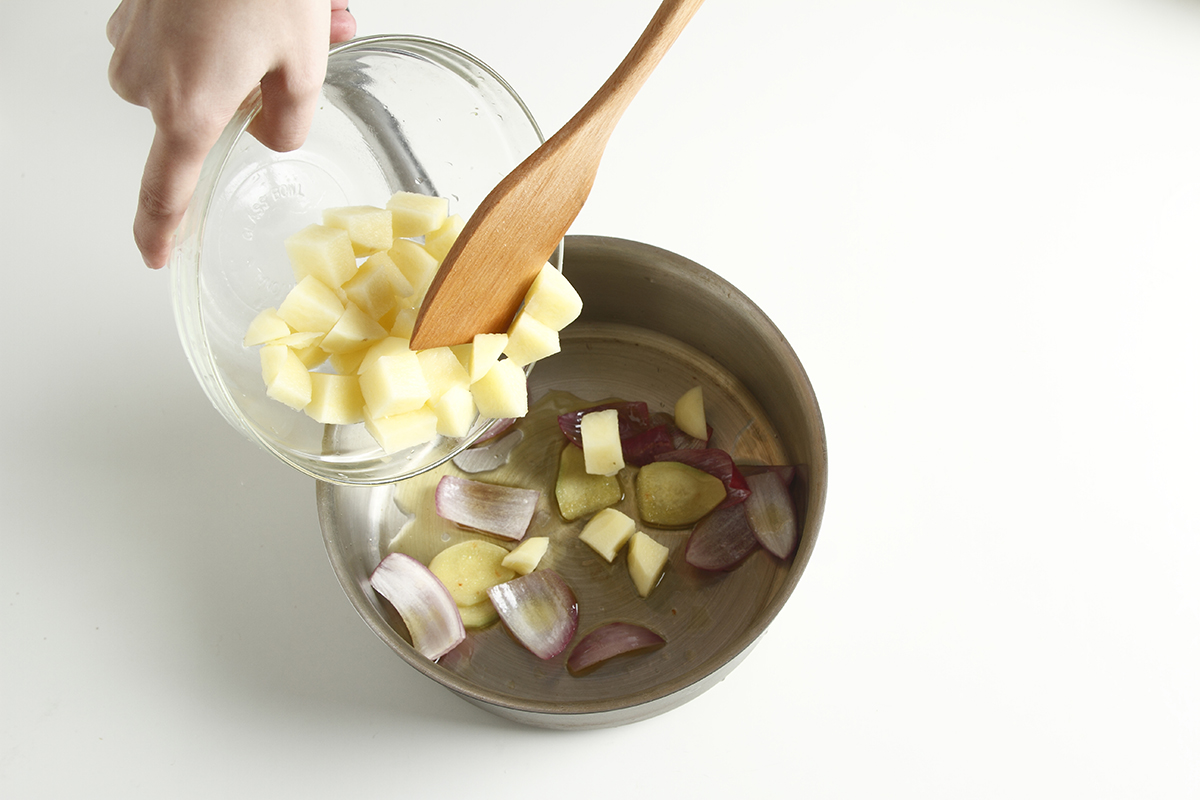 3. 热锅倒入橄榄油,下入洋葱块、姜片、蒜片炒香,加入土豆块和适量清水大火煮开。