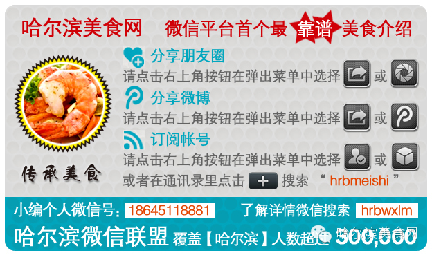 (各位吃货们,有任何好的美食,都可以发350个汉字以内含电话和店名还有地址,在加上4-6张图片,本微信平台免费群发,宣传给更多吃货们。发送到邮件地址:hrbbbs@qq.com)