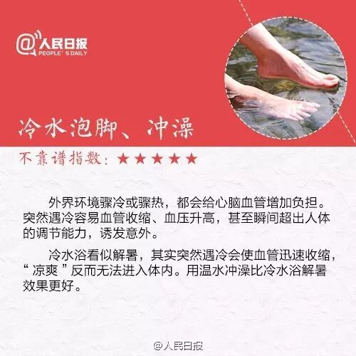 当人体在大汗淋漓时,全身的毛孔都被打开了,如果这个时候突然用冷水浇身,很容易引起发烧、感冒。另外,凉水洗澡并不能帮助身体放松,反而会使肌肉更紧张,正确的方法是等身上的汗都干了再用温水冲澡。