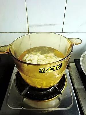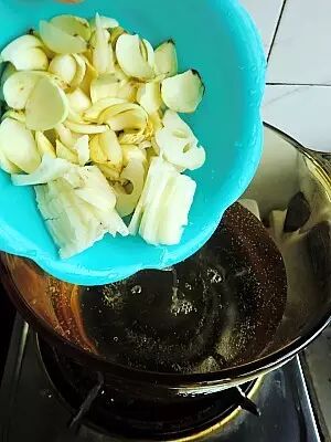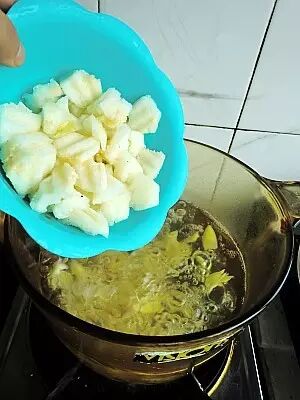 鲜百合洗净剥片,莲藕去皮切片放入汤锅中。