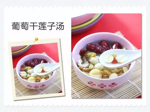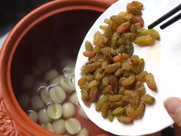 步骤3:与葡萄干一起装入锅内,加水800毫升左右。用旺火烧开后改用文火,煲至莲子熟烂时停火,喝汤吃料。