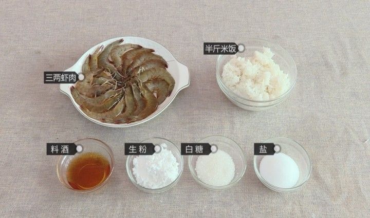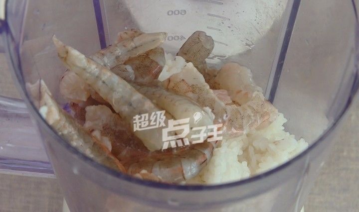 将米饭和虾倒入搅拌机里,放1勺生粉,增加它的粘稠度,这样虾条更容易成型。▽