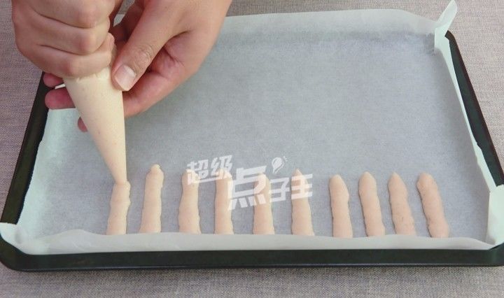 像挤奶油一样把虾蓉挤在烤盘上,大概挤成小拇指大小就可以了。▽