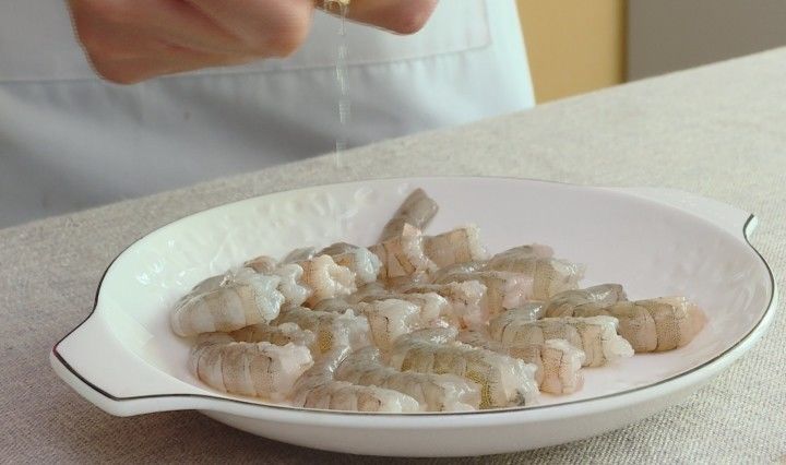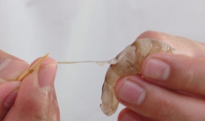 把牙签戳进虾背处,慢慢往上提,把虾线去掉。▽